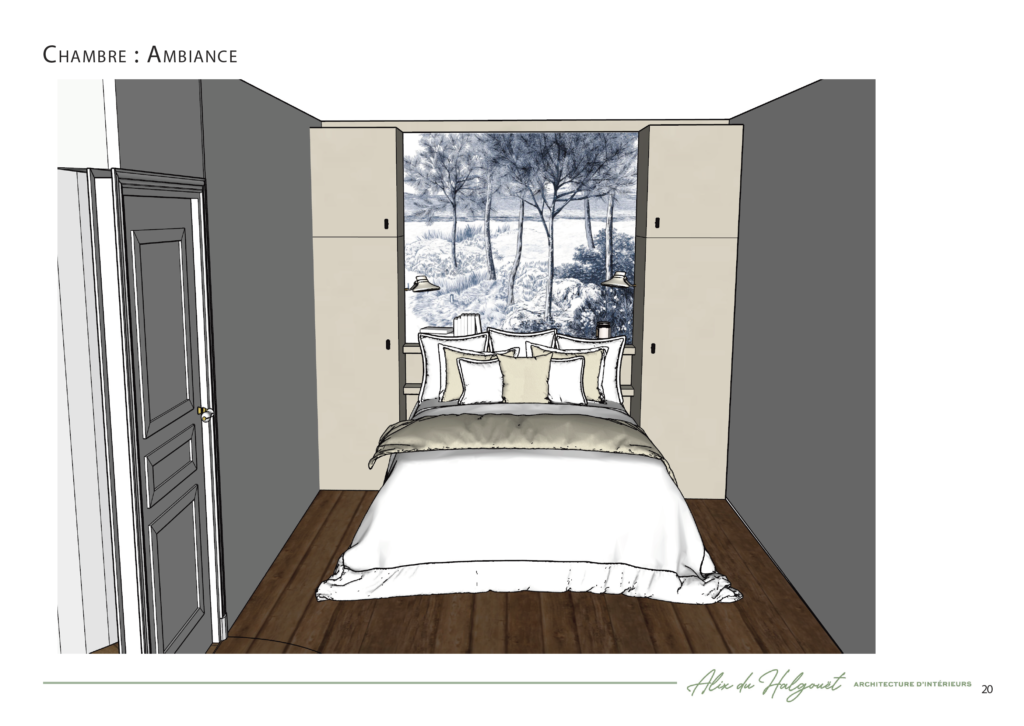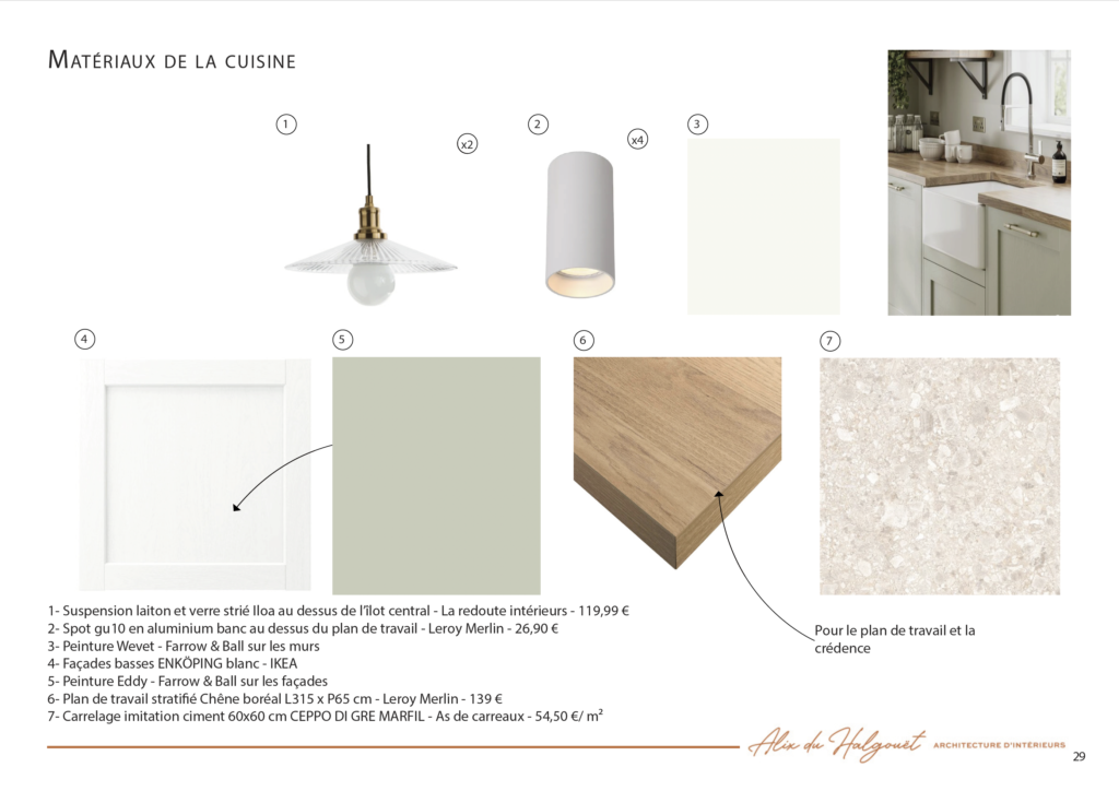 - Création de moodboards et planches d’ambiance (choix des matériaux et des éclairages)