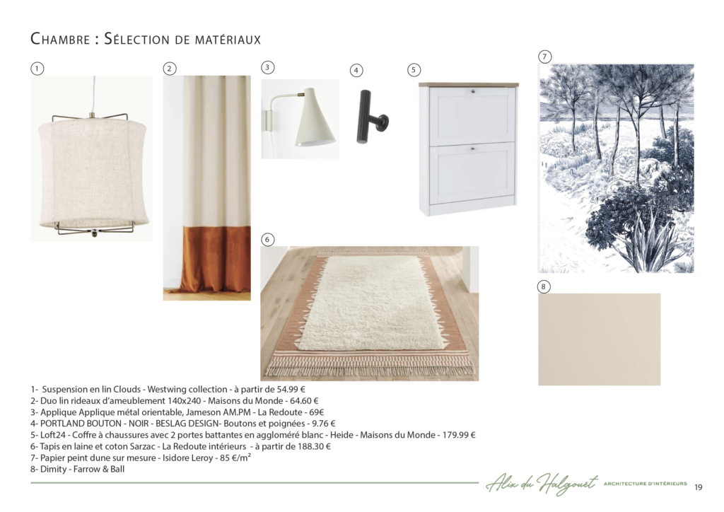 - Sélection de revêtements, de mobiliers ou d’éléments décoratifs en harmonie avec le projet à partir d’une liste de besoins préalablement définie (papier peint, peinture, luminaires, tapis, canapé, rideaux, miroirs, tables, assises, bureau, …)