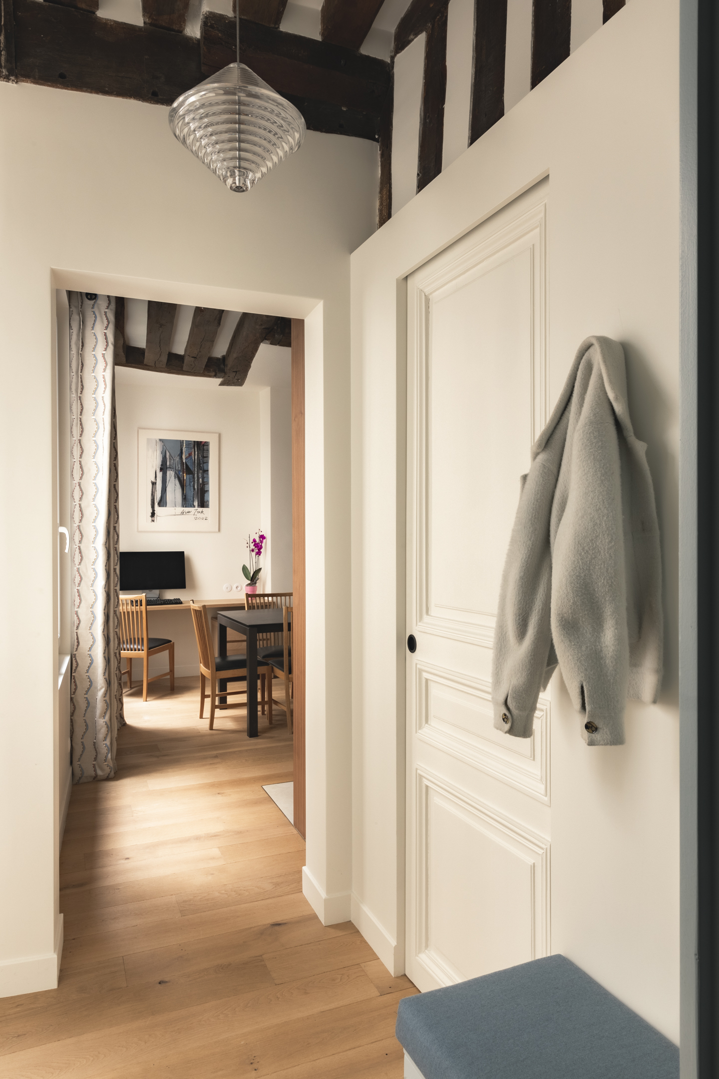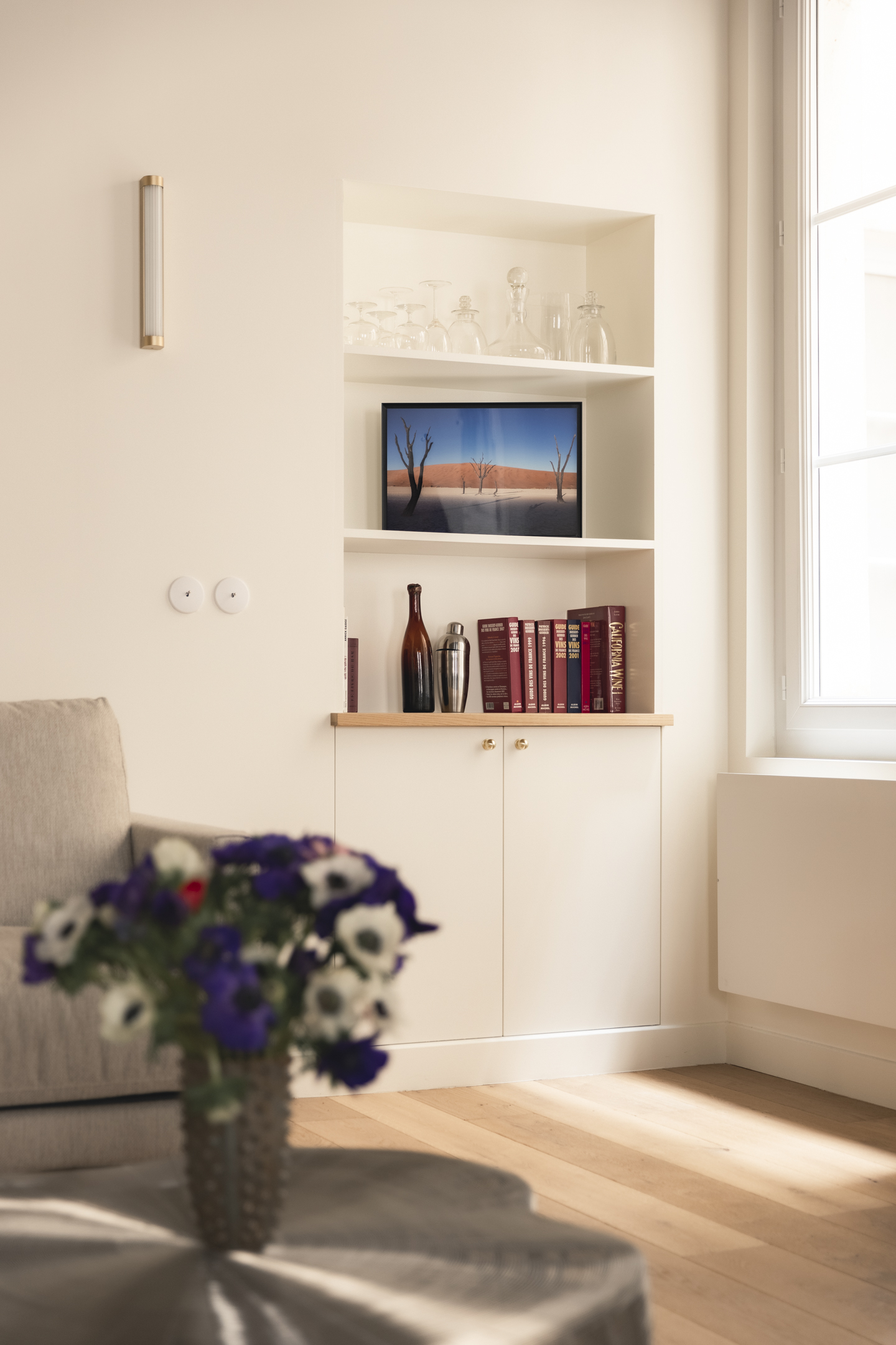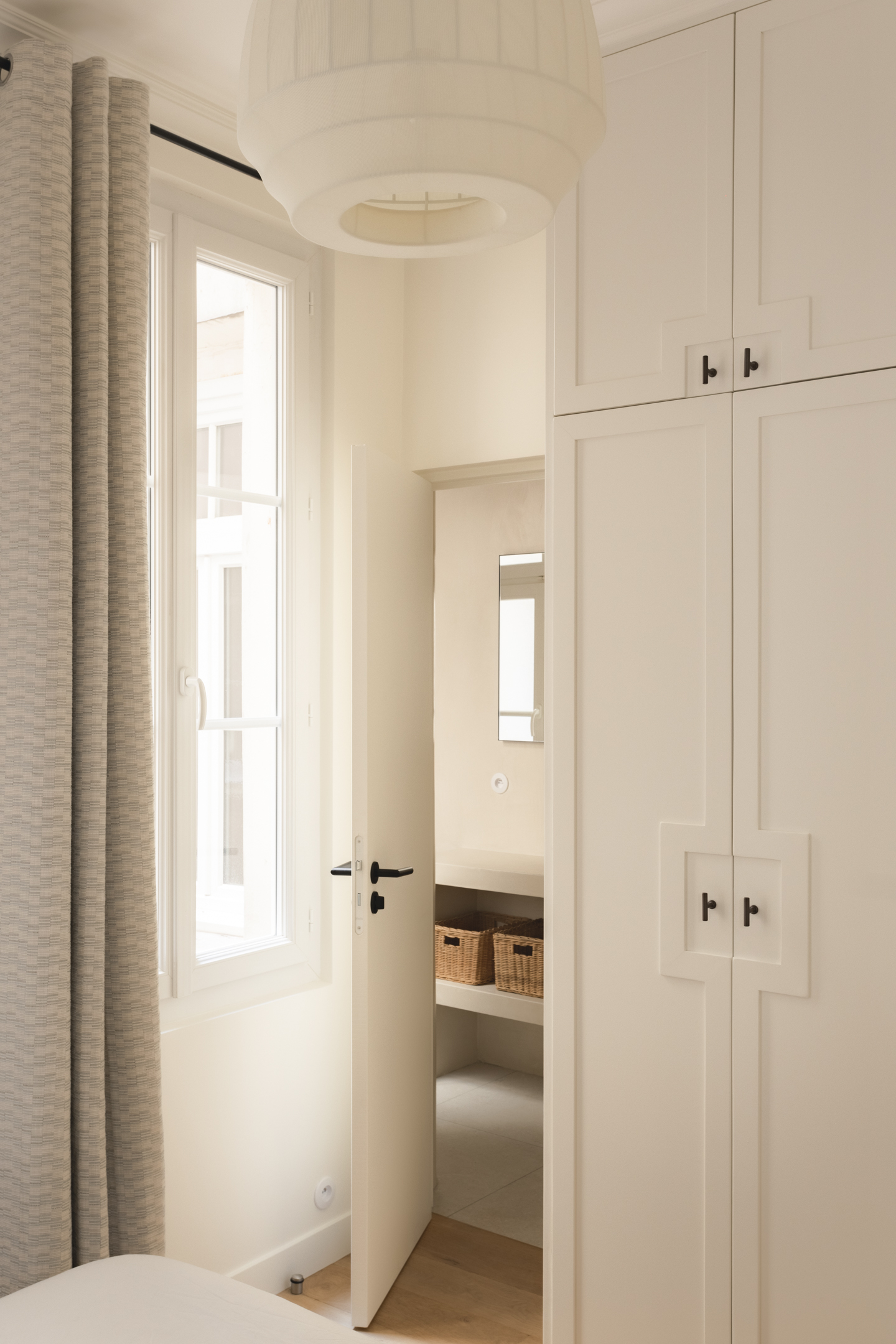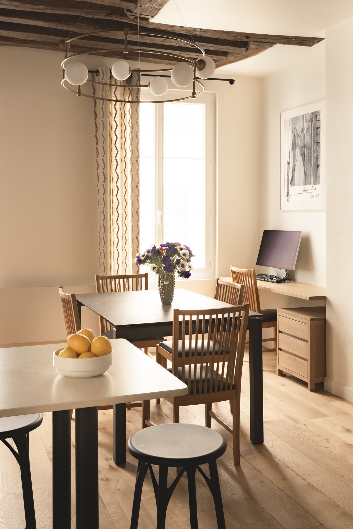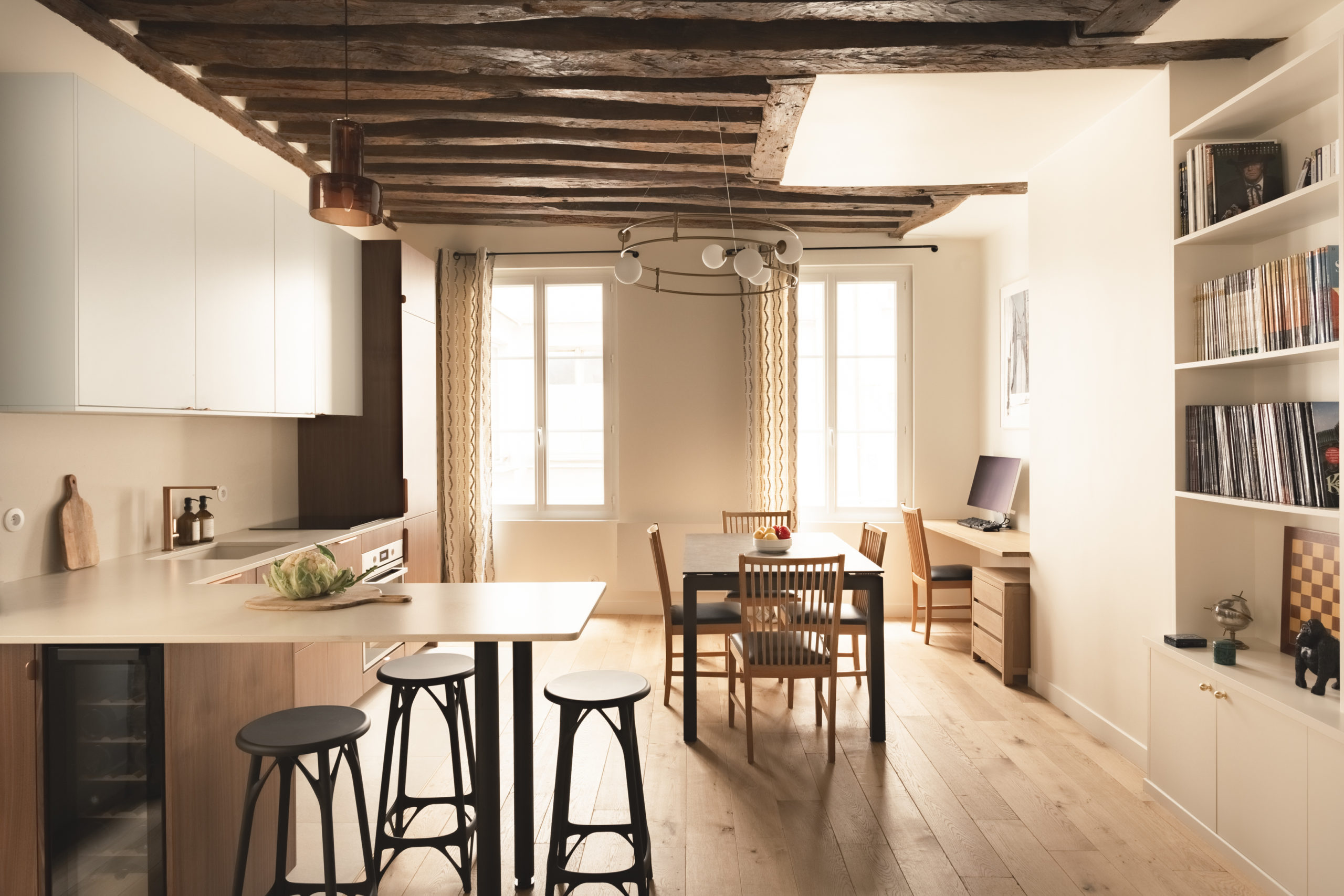 Situé au 1er étage d’un bel immeuble XVIIIème, cet appartement méritait qu’on lui redonne ses lettres de noblesse. Il pâtissait d’un agencement très peu pratique et de matériaux datés. On a repensé toute la circulation en prenant le parti de mettre la cuisine et le coin bureau dans l’espace de vie agrandi. La chambre bénéficie désormais d’un grand dressing et d’une salle de bain attenante, et les toilettes sont séparés. Côté décoration on a jouer sur un mix de matériaux (parquet massif, peinture à la chaux, béton ciré, noyer,…) et des teintes claires pour garder un maximum de luminosité.