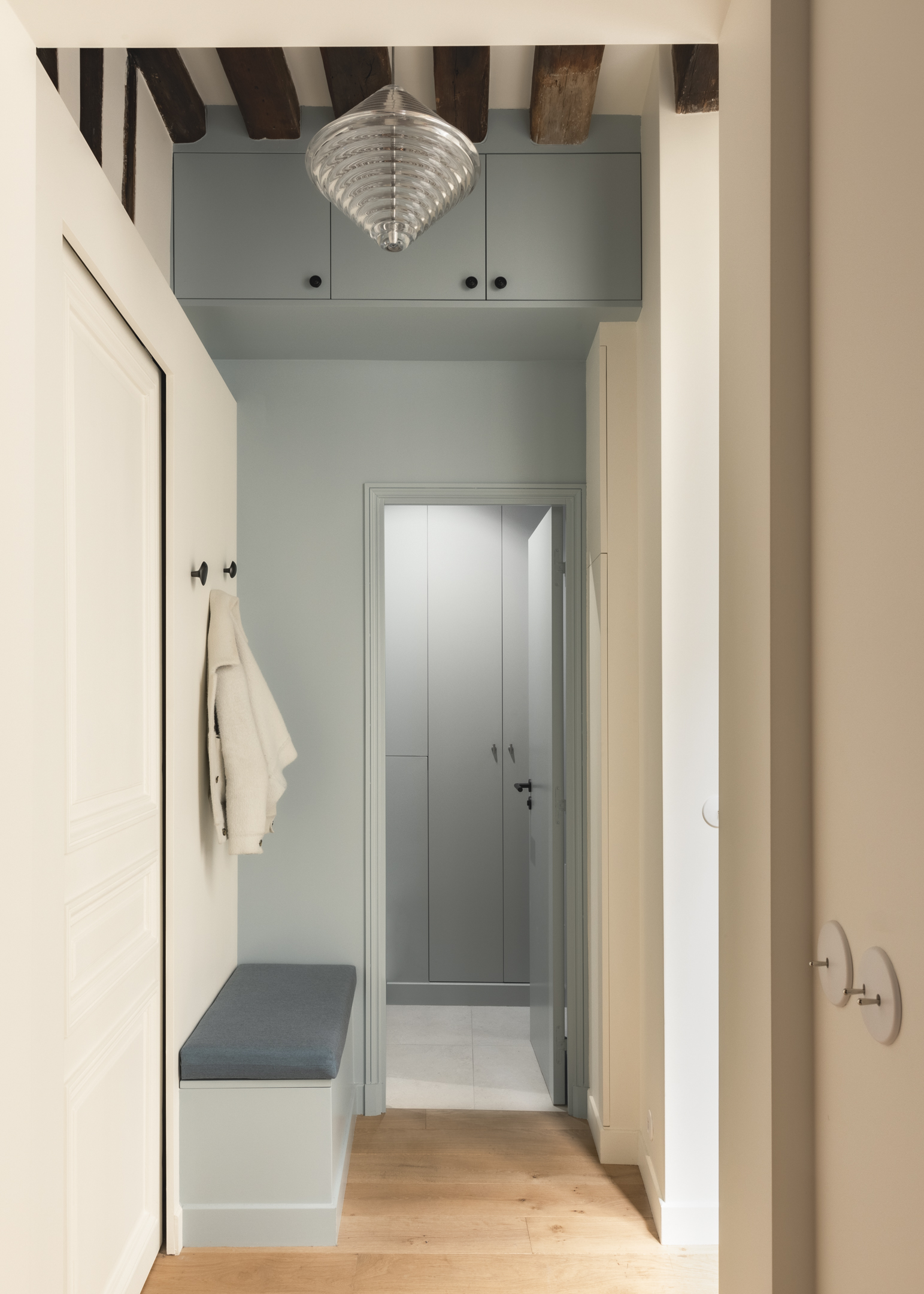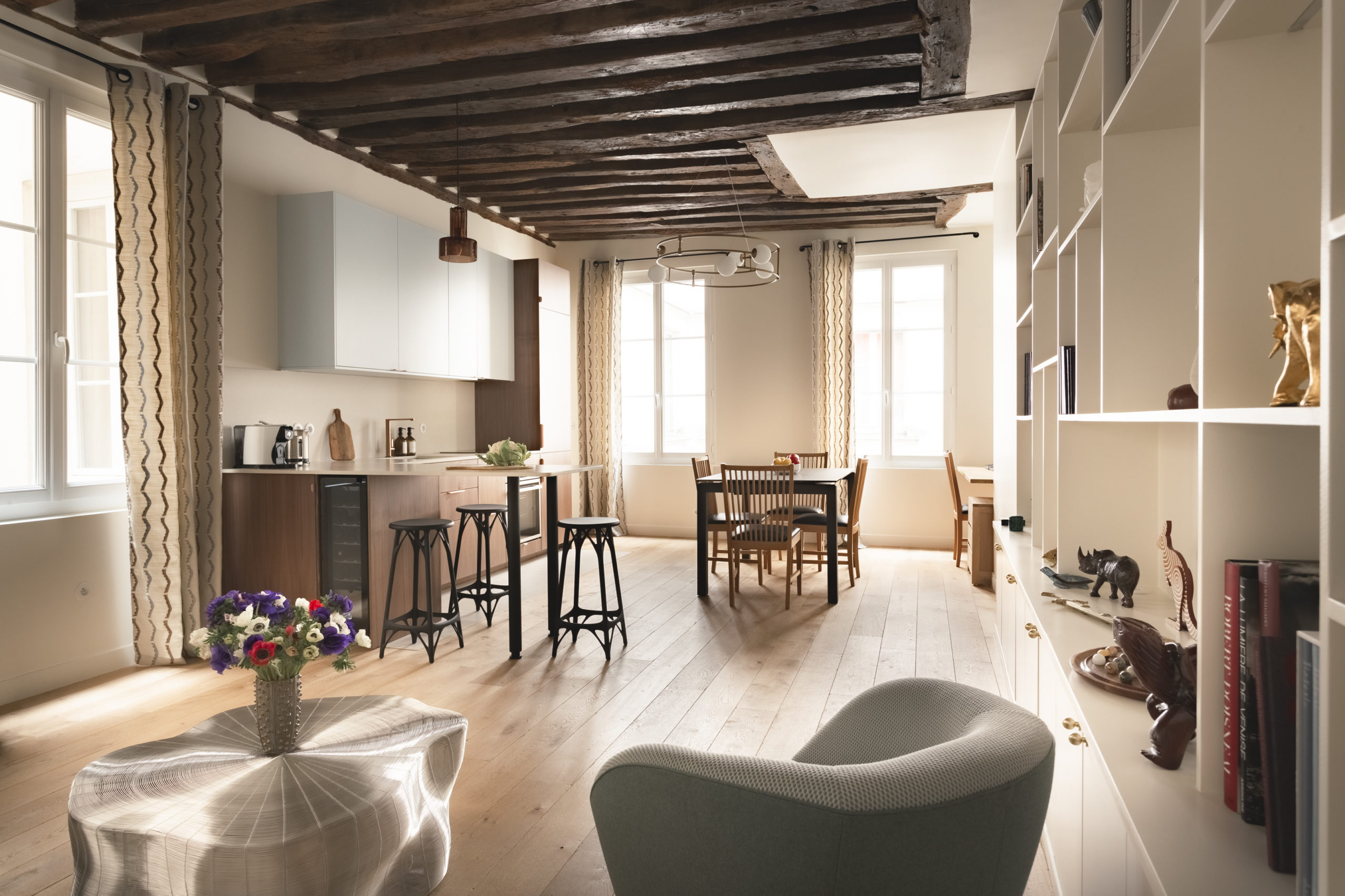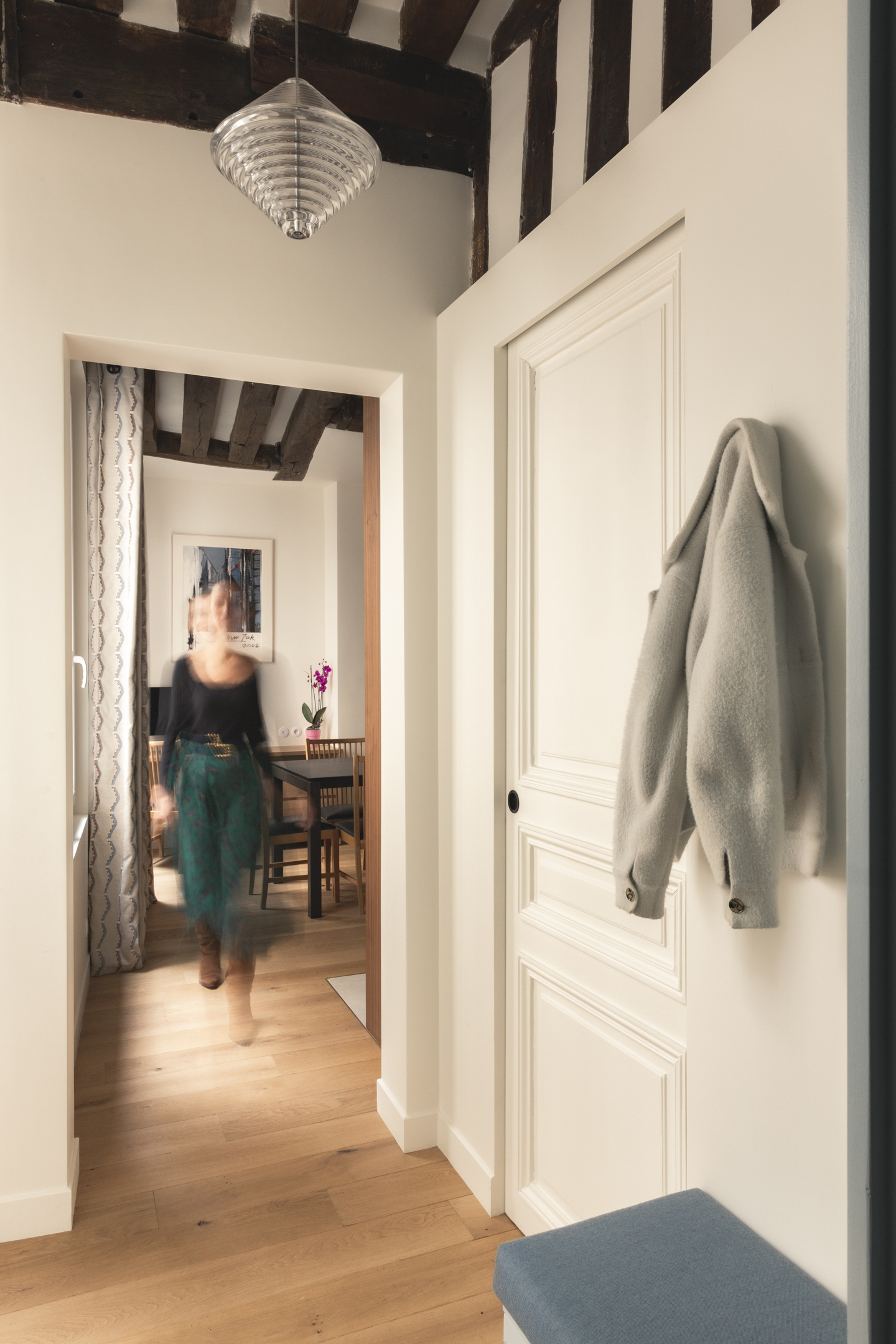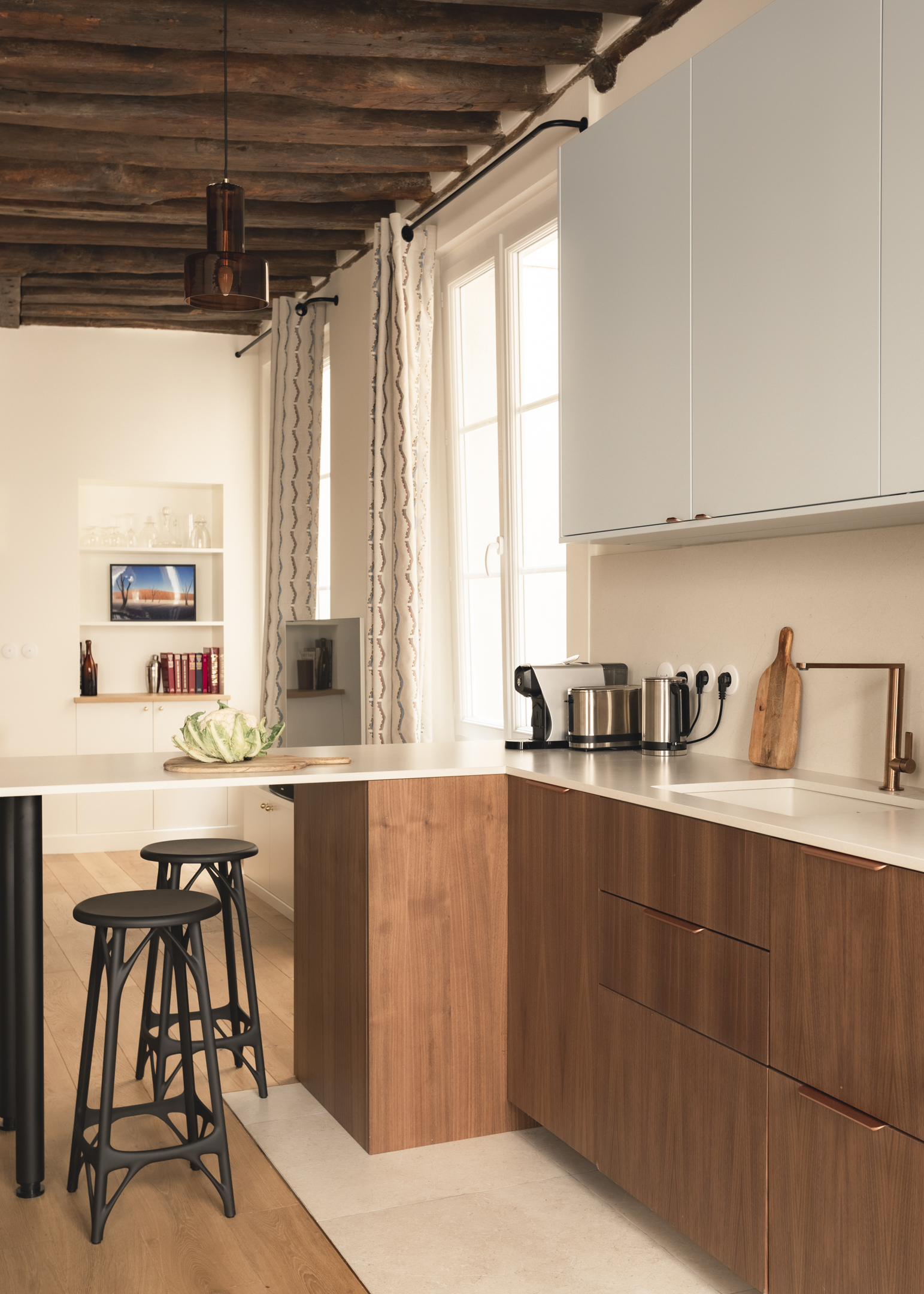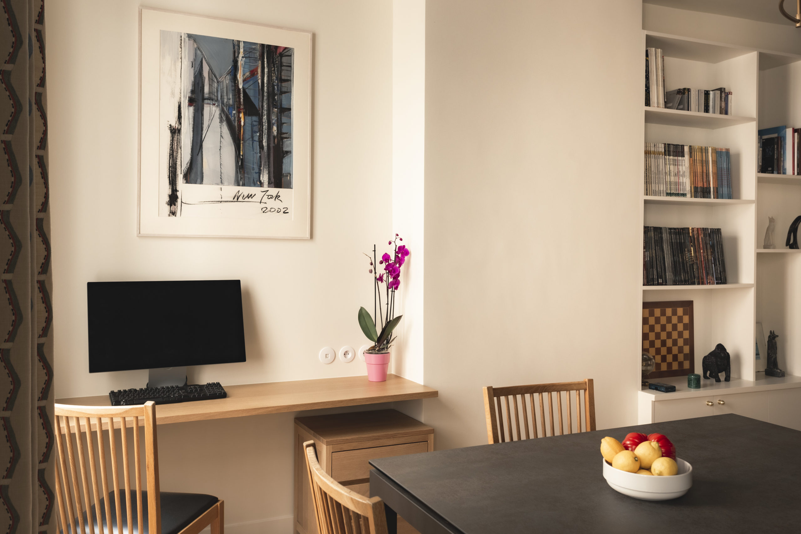Situé au 1er étage d’un bel immeuble XVIIIème, cet appartement méritait qu’on lui redonne ses lettres de noblesse. Il pâtissait d’un agencement très peu pratique et de matériaux datés. On a repensé toute la circulation en prenant le parti de mettre la cuisine et le coin bureau dans l’espace de vie agrandi. La chambre bénéficie désormais d’un grand dressing et d’une salle de bain attenante, et les toilettes sont séparés. Côté décoration on a jouer sur un mix de matériaux (parquet massif, peinture à la chaux, béton ciré, noyer,…) et des teintes claires pour garder un maximum de luminosité.