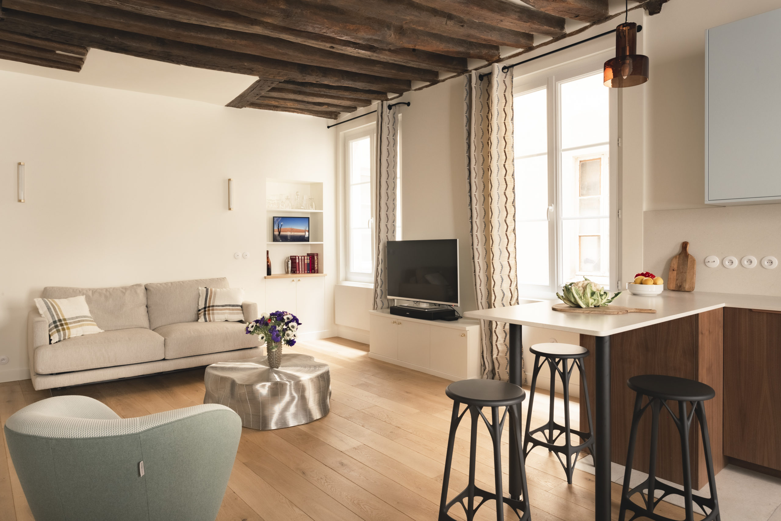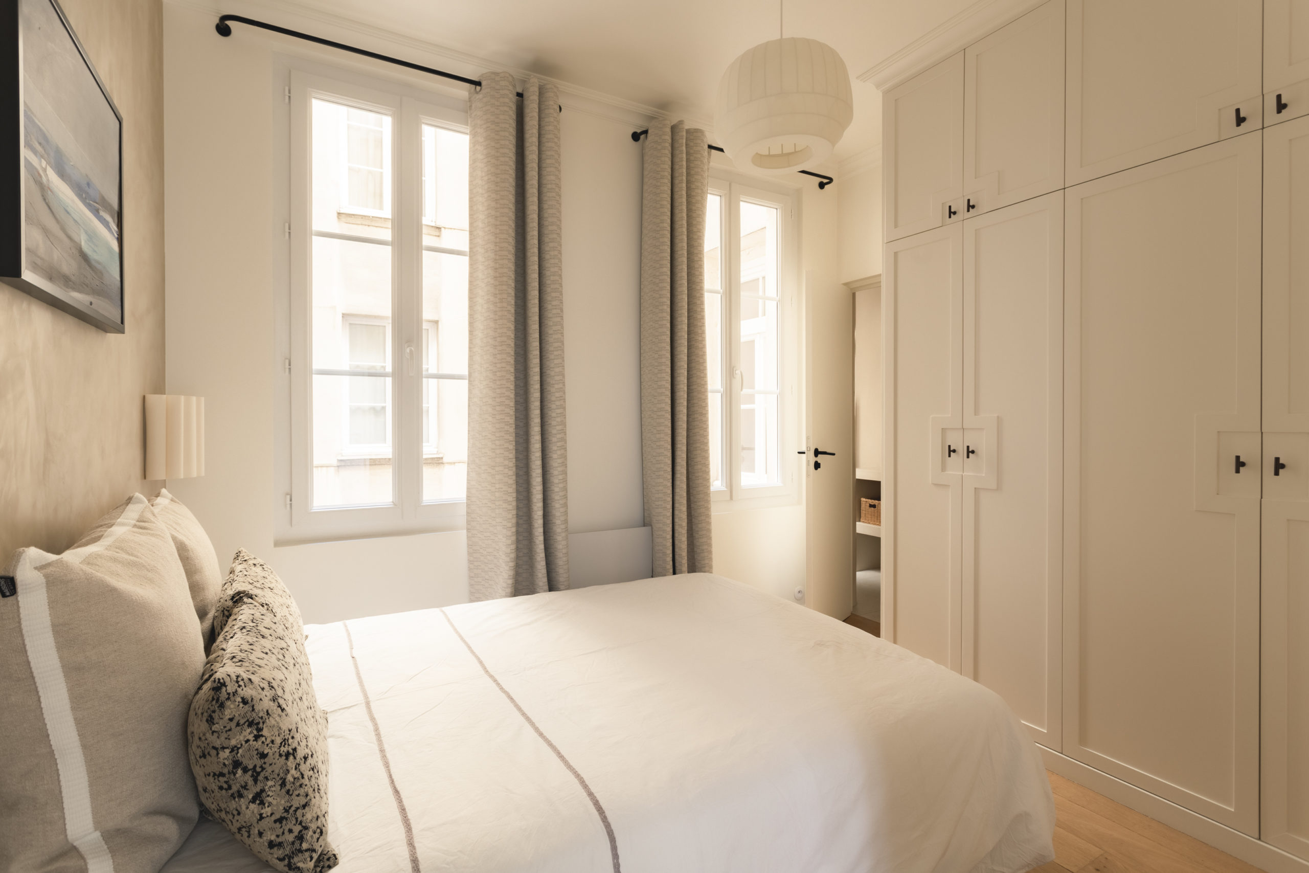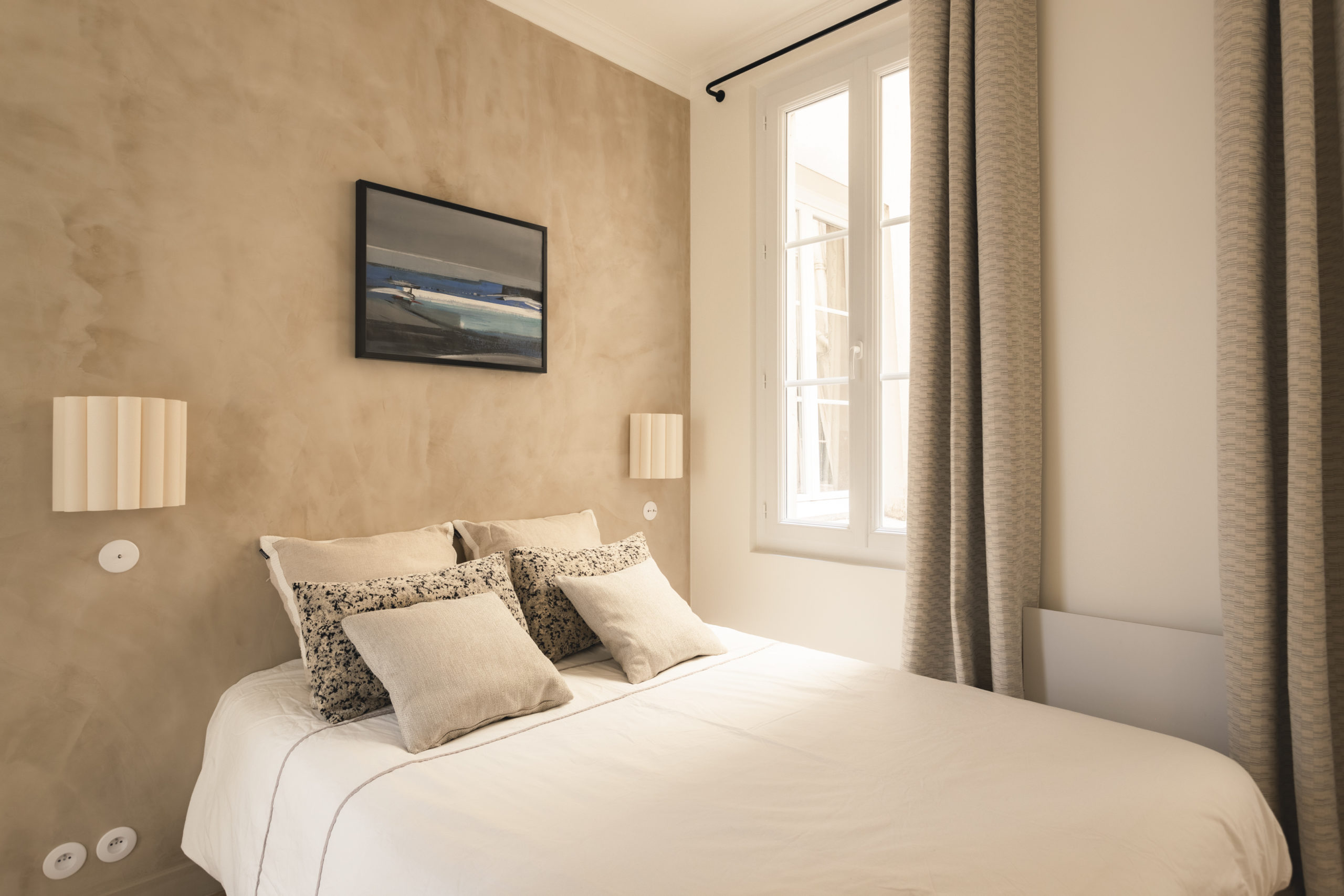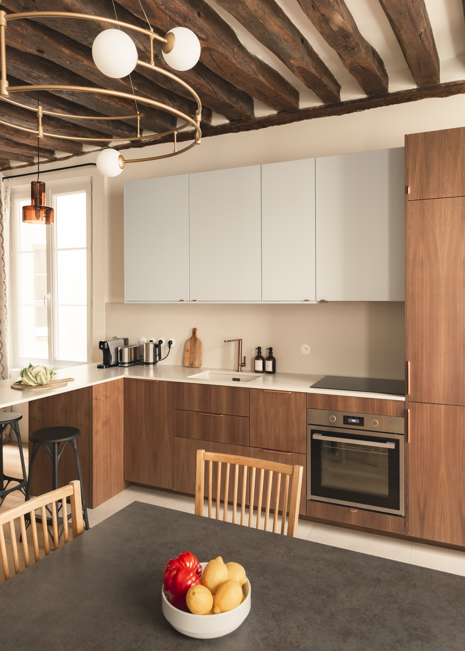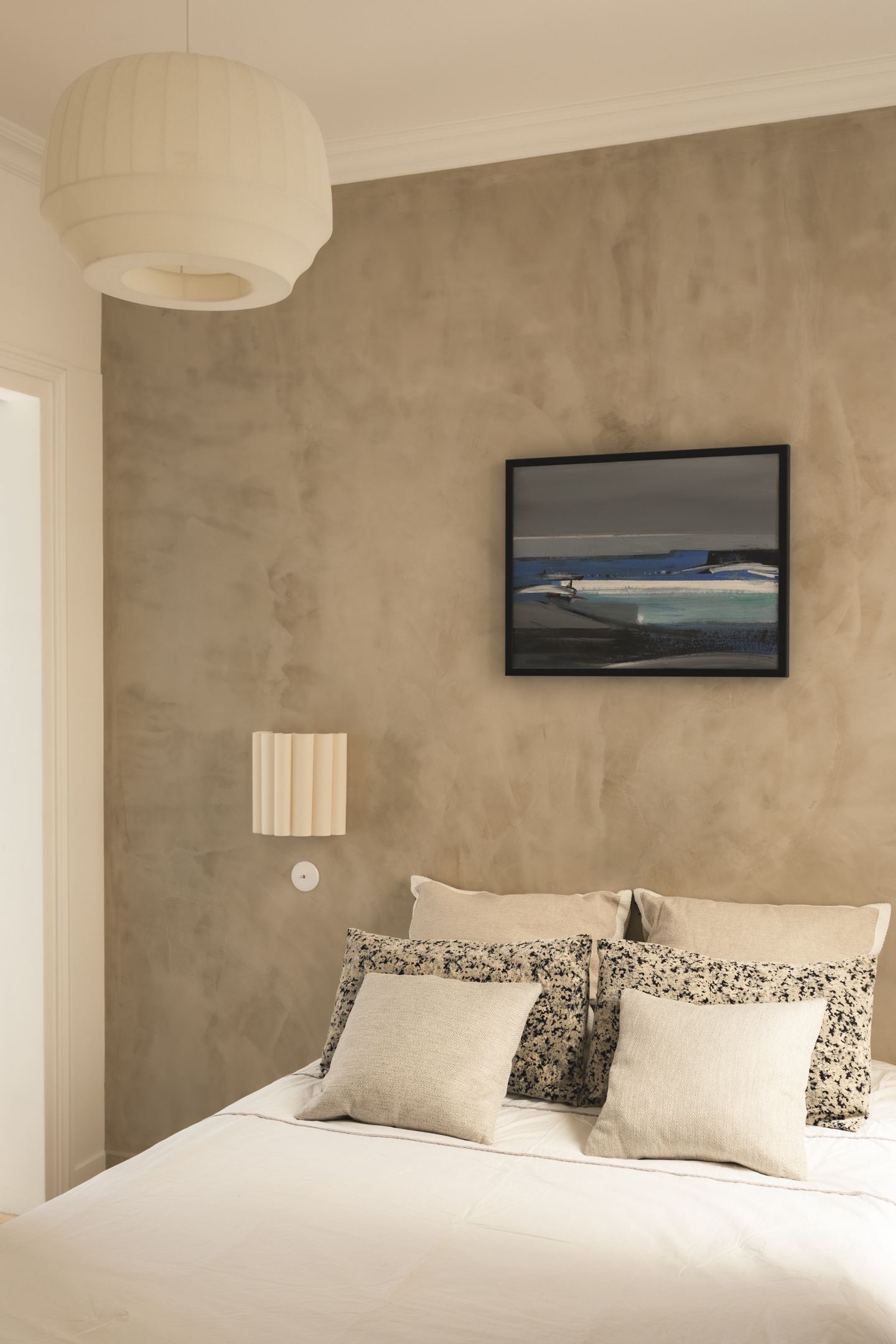 Situé au 1er étage d’un bel immeuble XVIIIème, cet appartement méritait qu’on lui redonne ses lettres de noblesse. Il pâtissait d’un agencement très peu pratique et de matériaux datés. On a repensé toute la circulation en prenant le parti de mettre la cuisine et le coin bureau dans l’espace de vie agrandi. La chambre bénéficie désormais d’un grand dressing et d’une salle de bain attenante, et les toilettes sont séparés. Côté décoration on a jouer sur un mix de matériaux (parquet massif, peinture à la chaux, béton ciré, noyer,…) et des teintes claires pour garder un maximum de luminosité.