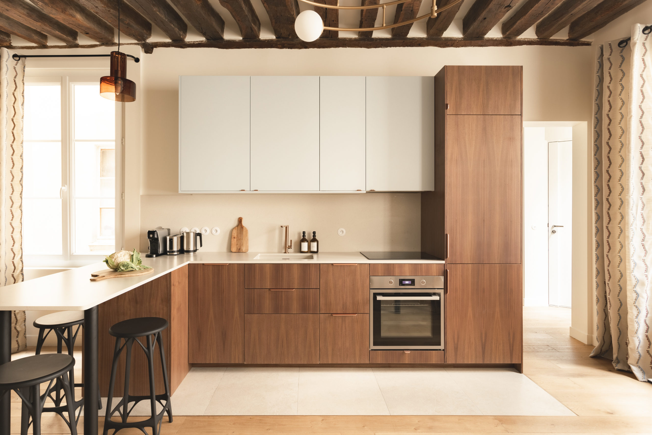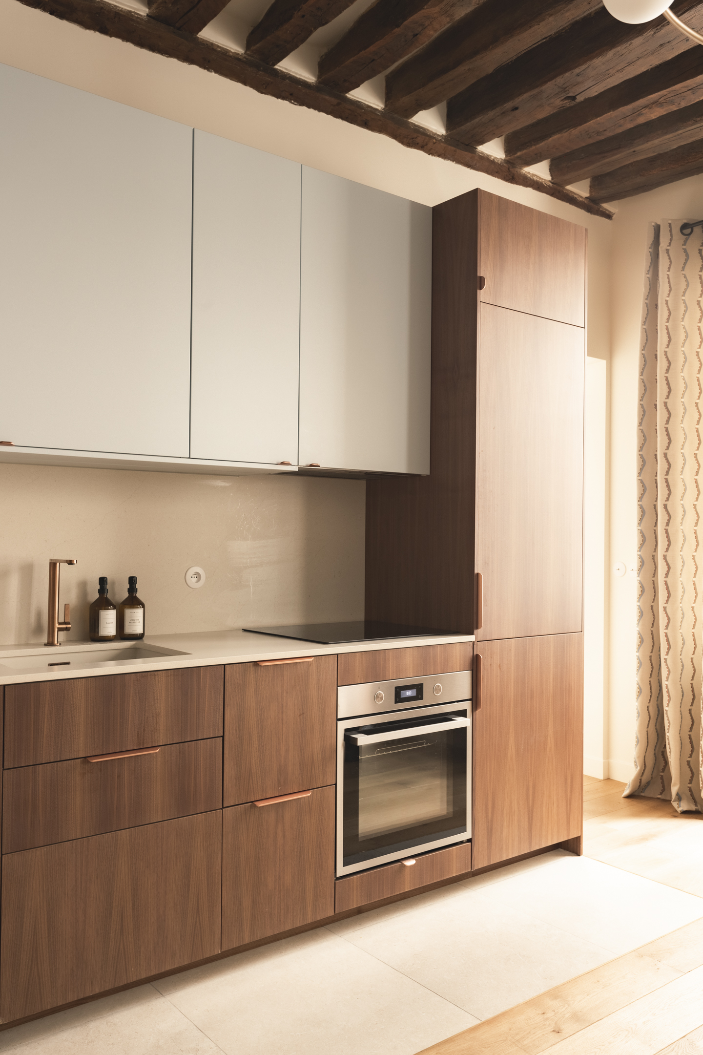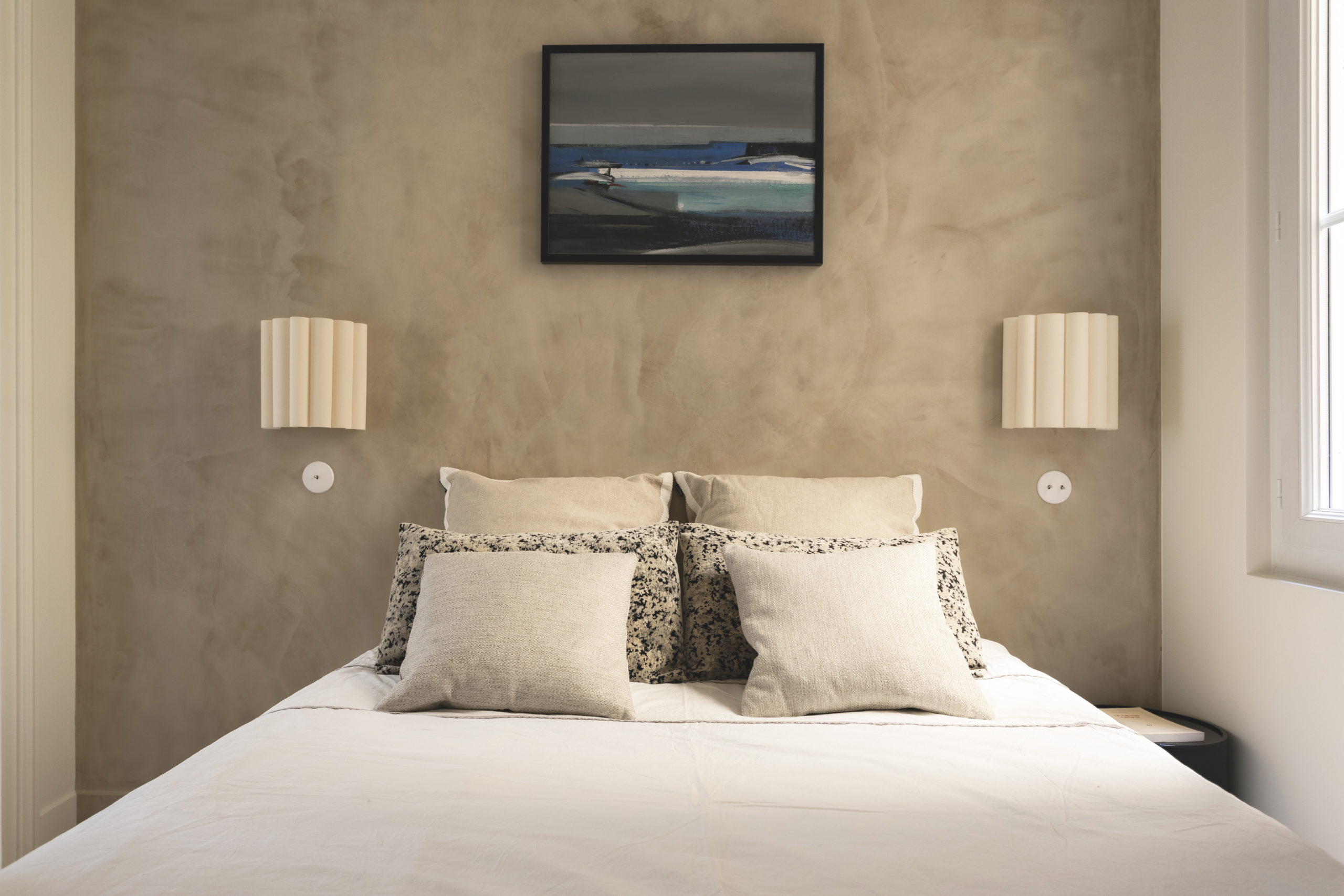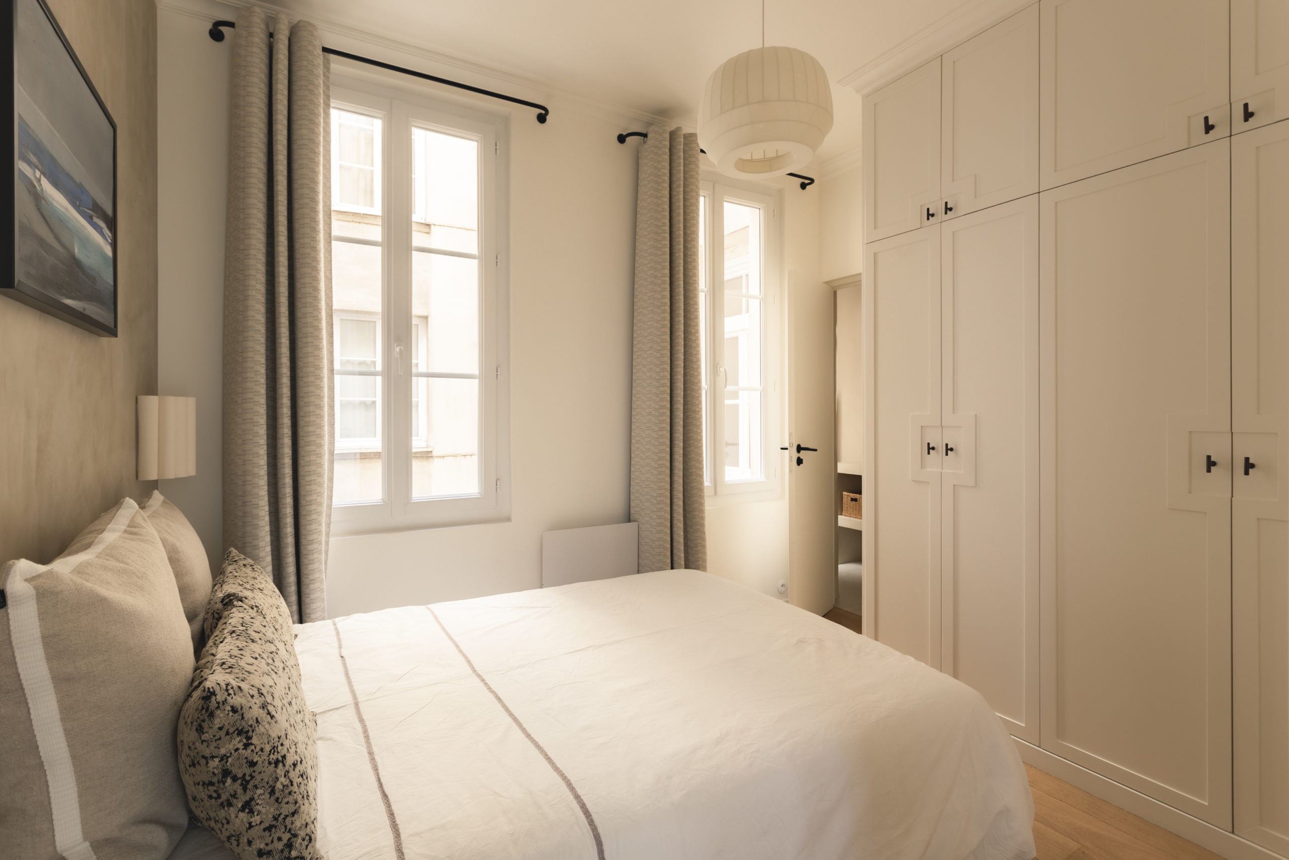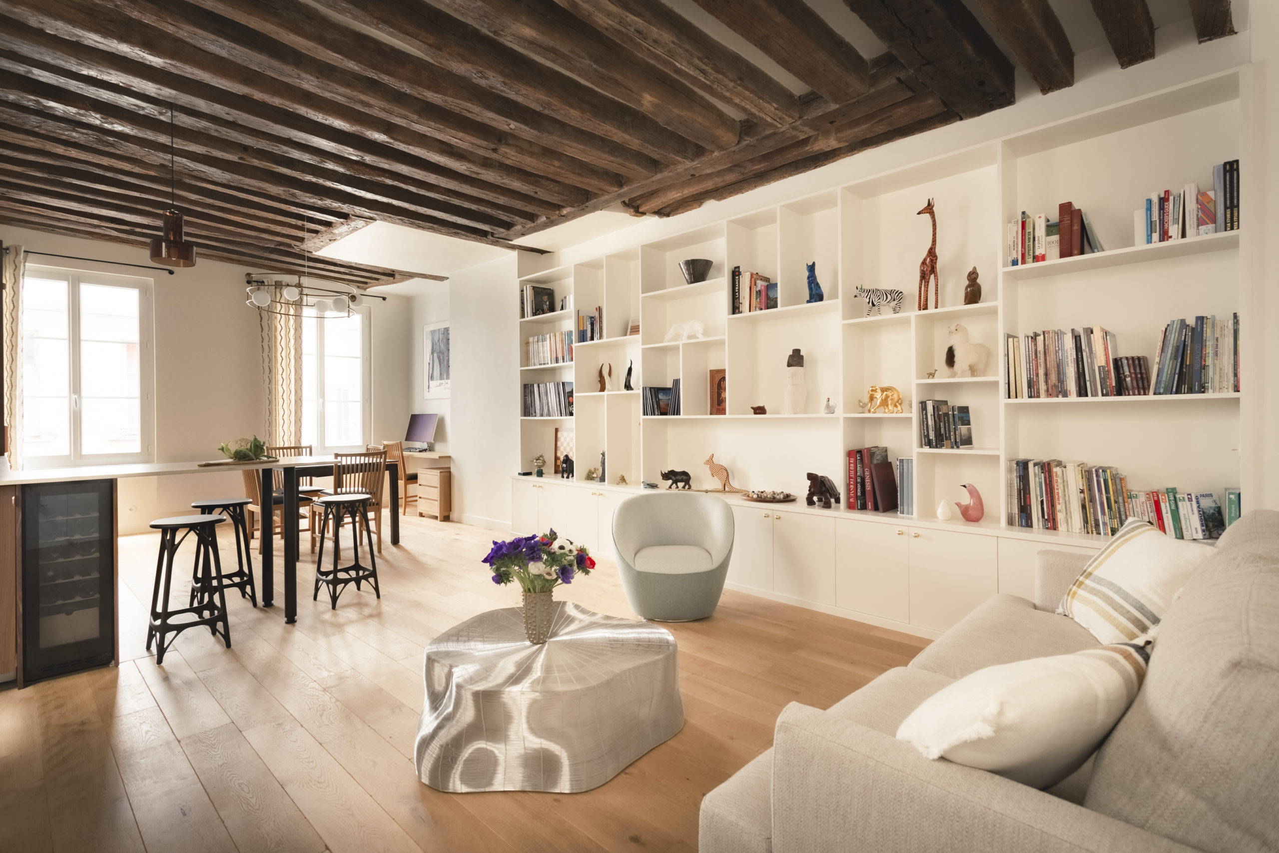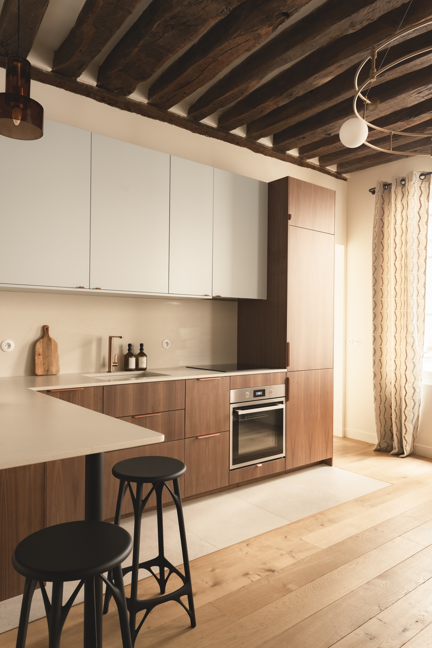 Situé au 1er étage d’un bel immeuble XVIIIème, cet appartement méritait qu’on lui redonne ses lettres de noblesse. Il pâtissait d’un agencement très peu pratique et de matériaux datés. On a repensé toute la circulation en prenant le parti de mettre la cuisine et le coin bureau dans l’espace de vie agrandi. La chambre bénéficie désormais d’un grand dressing et d’une salle de bain attenante, et les toilettes sont séparés. Côté décoration on a jouer sur un mix de matériaux (parquet massif, peinture à la chaux, béton ciré, noyer,…) et des teintes claires pour garder un maximum de luminosité.