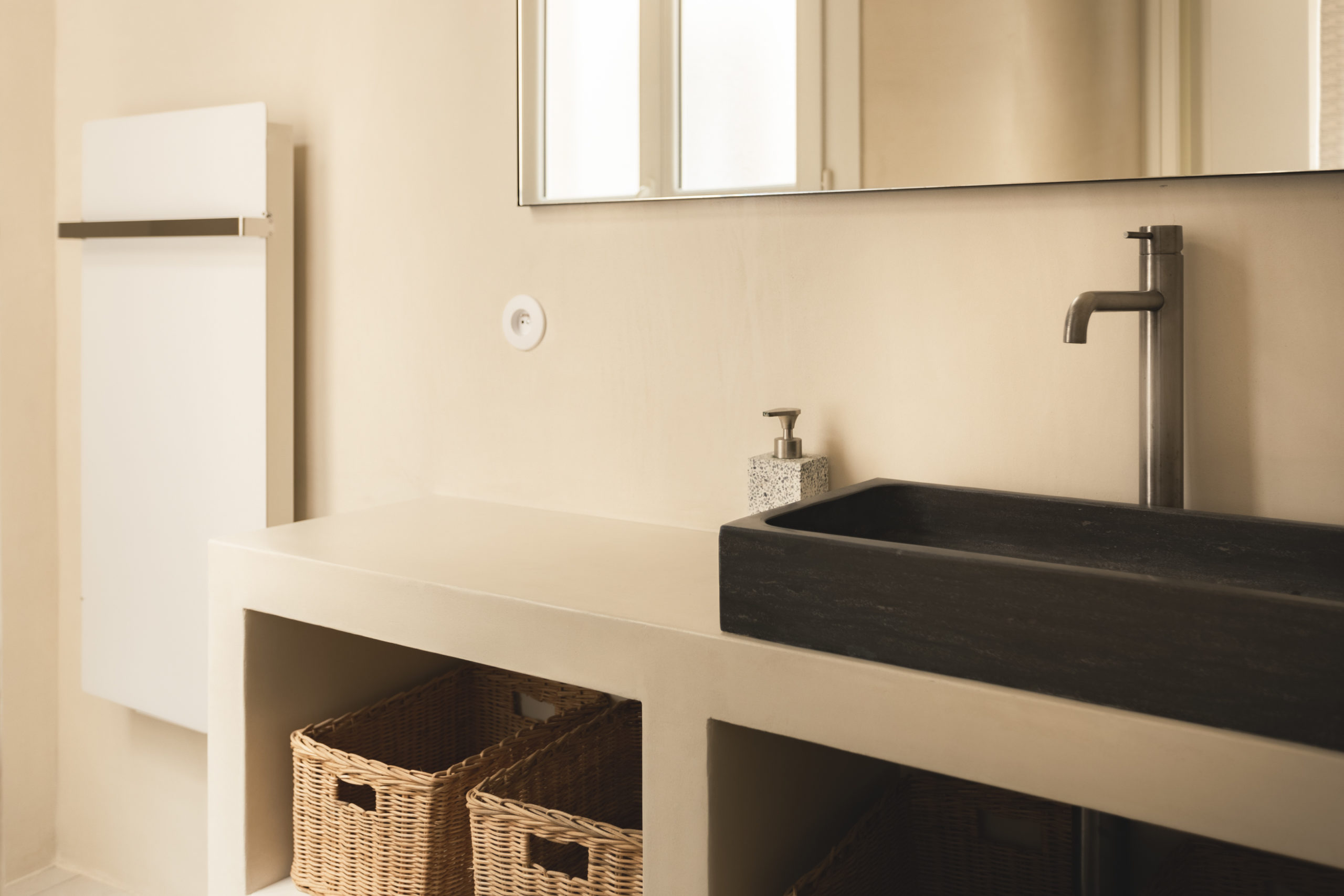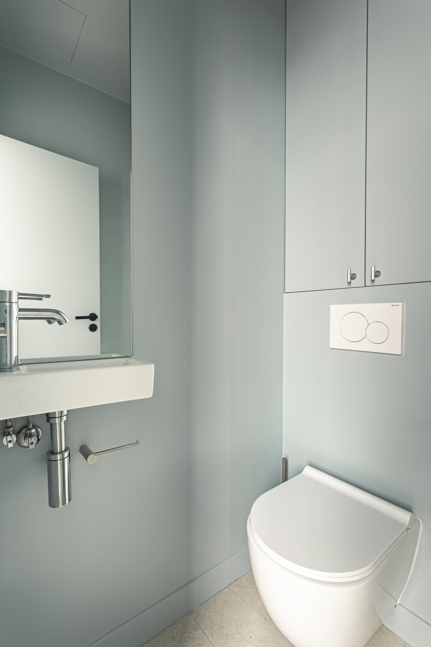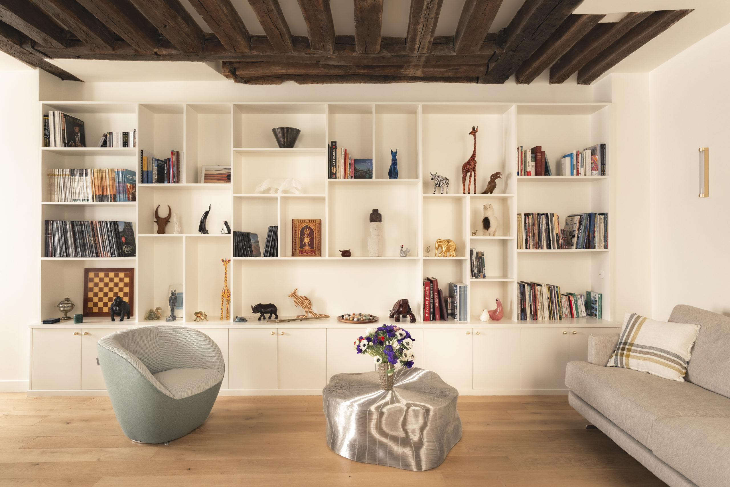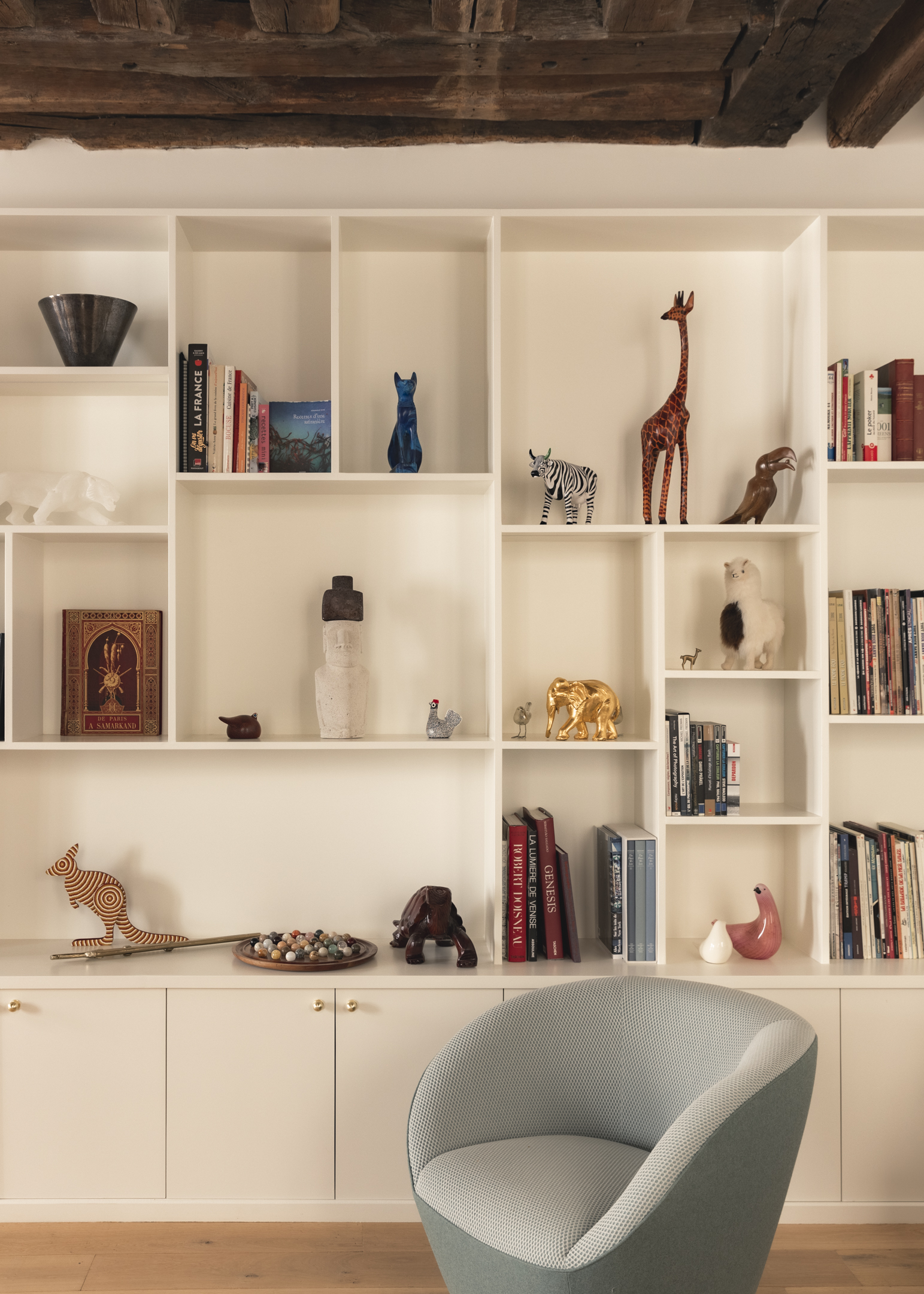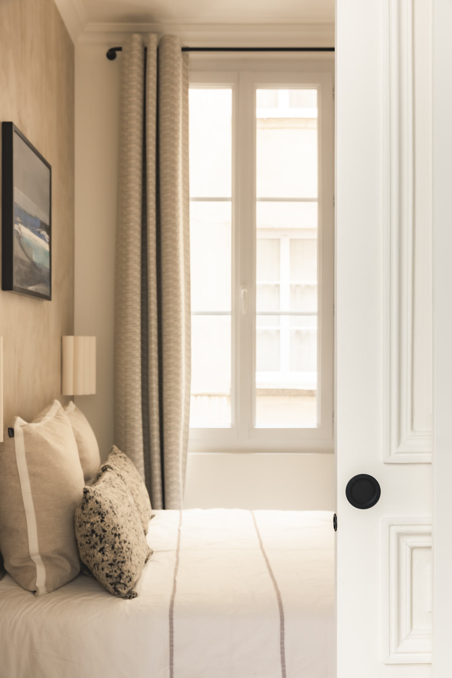 Situé au 1er étage d’un bel immeuble XVIIIème, cet appartement méritait qu’on lui redonne ses lettres de noblesse. Il pâtissait d’un agencement très peu pratique et de matériaux datés. On a repensé toute la circulation en prenant le parti de mettre la cuisine et le coin bureau dans l’espace de vie agrandi. La chambre bénéficie désormais d’un grand dressing et d’une salle de bain attenante, et les toilettes sont séparés. Côté décoration on a jouer sur un mix de matériaux (parquet massif, peinture à la chaux, béton ciré, noyer,…) et des teintes claires pour garder un maximum de luminosité.