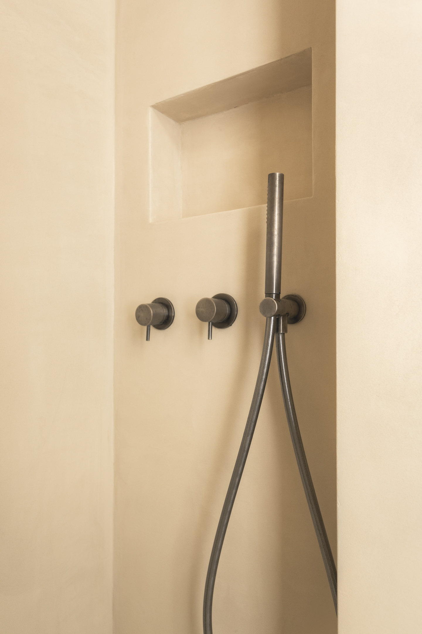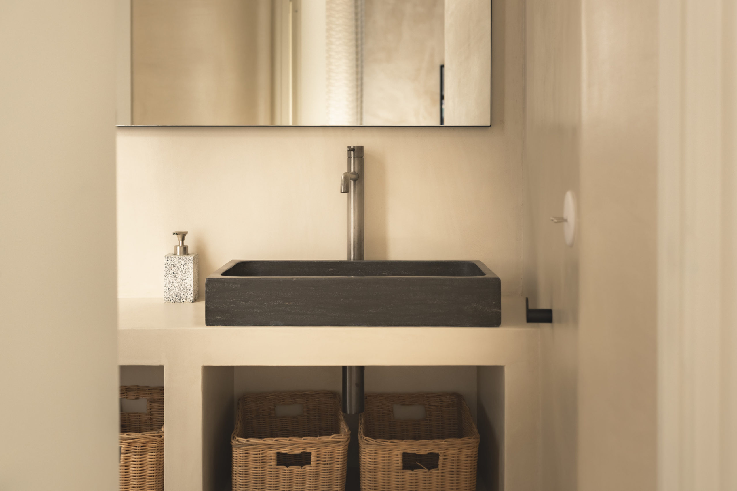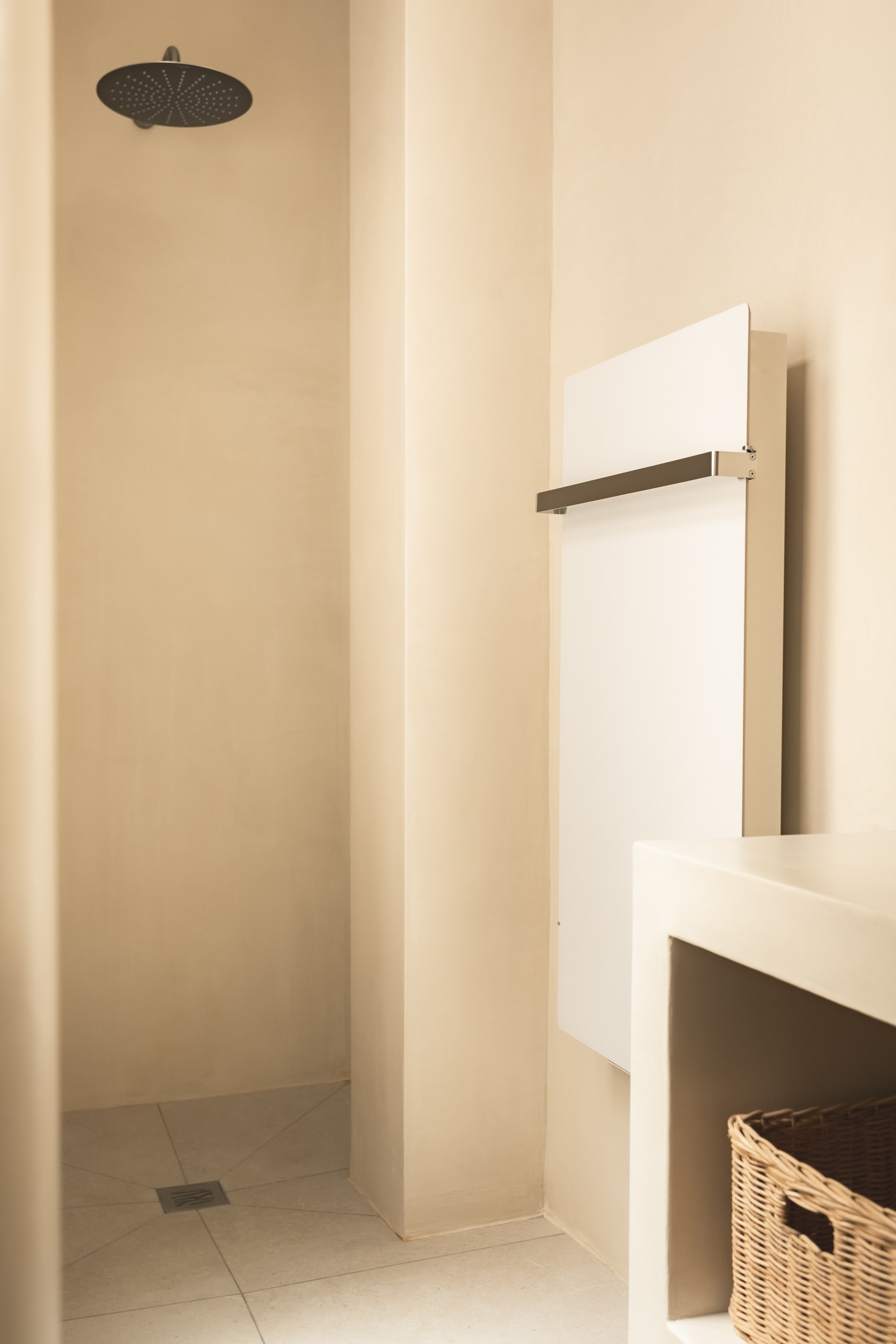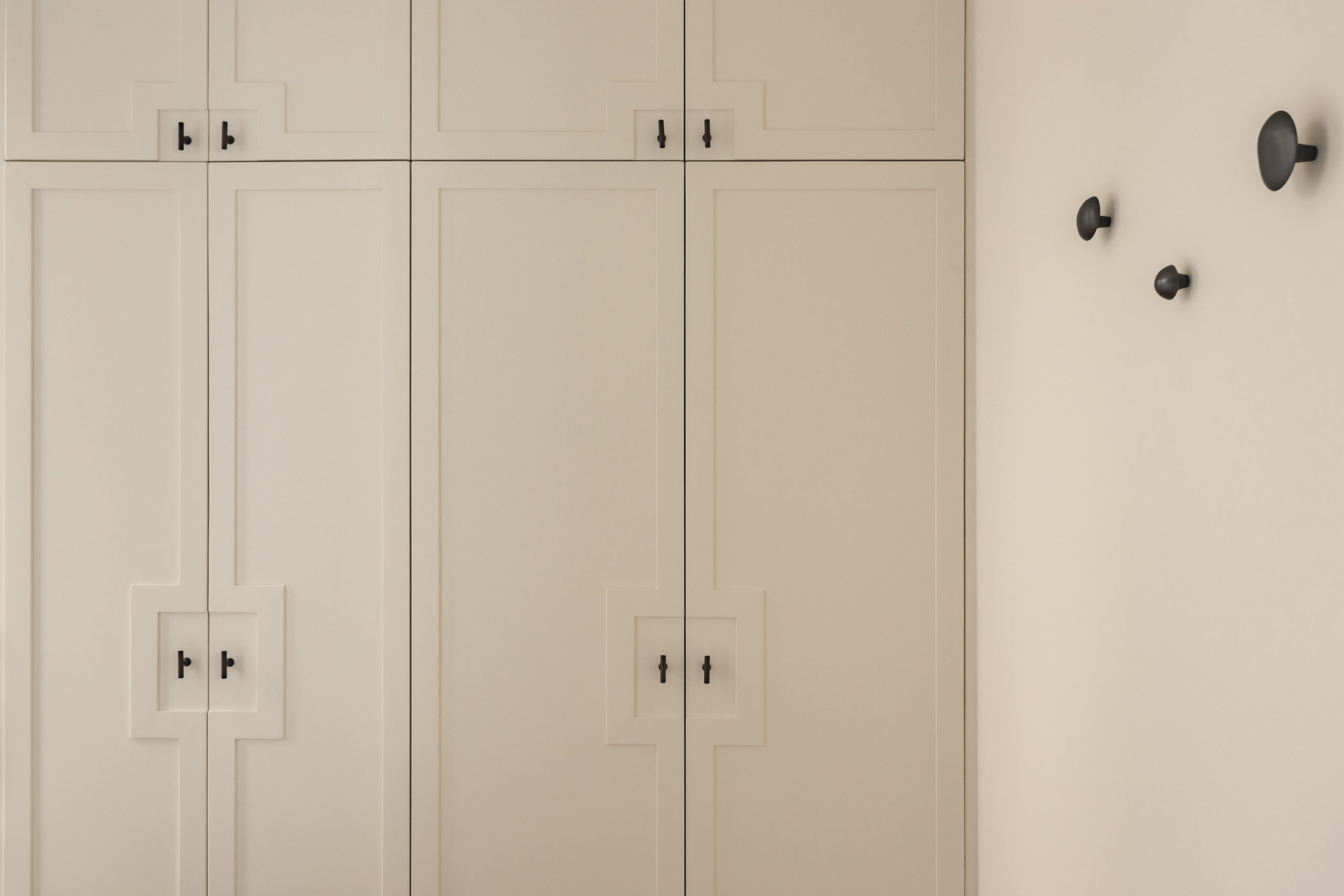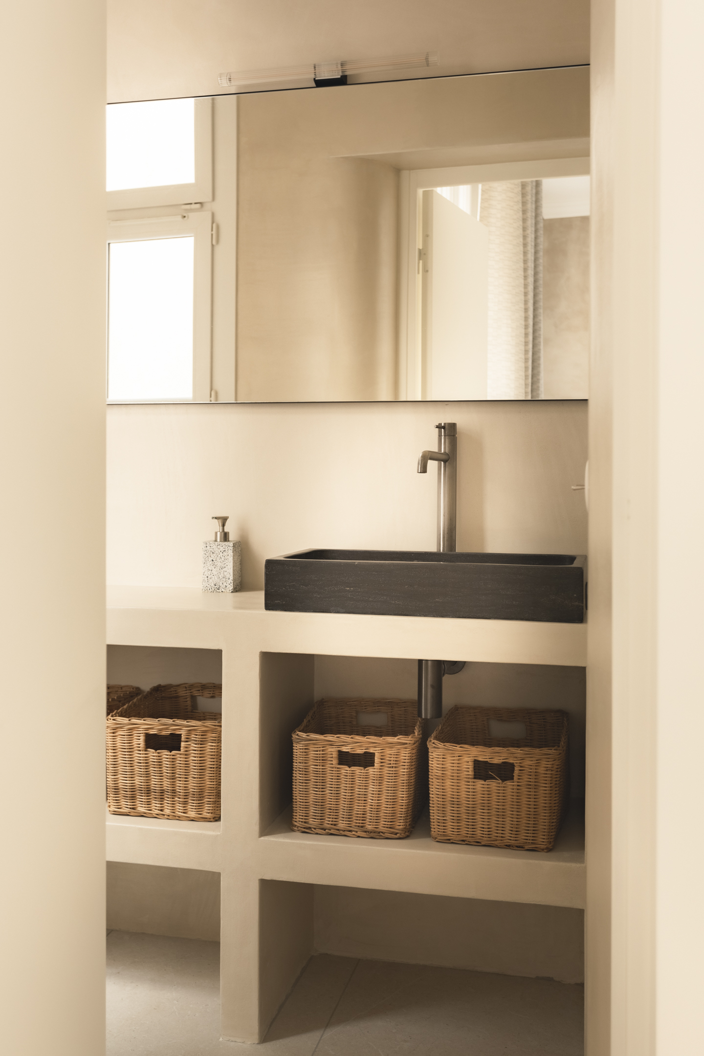 Situé au 1er étage d’un bel immeuble XVIIIème, cet appartement méritait qu’on lui redonne ses lettres de noblesse. Il pâtissait d’un agencement très peu pratique et de matériaux datés. On a repensé toute la circulation en prenant le parti de mettre la cuisine et le coin bureau dans l’espace de vie agrandi. La chambre bénéficie désormais d’un grand dressing et d’une salle de bain attenante, et les toilettes sont séparés. Côté décoration on a jouer sur un mix de matériaux (parquet massif, peinture à la chaux, béton ciré, noyer,…) et des teintes claires pour garder un maximum de luminosité.