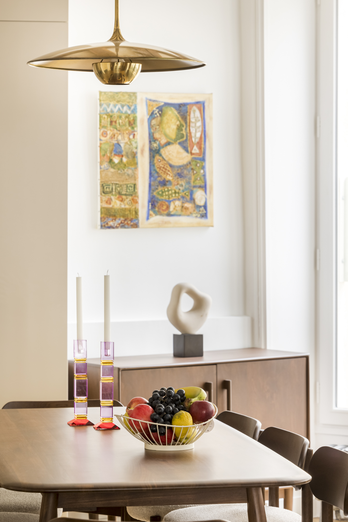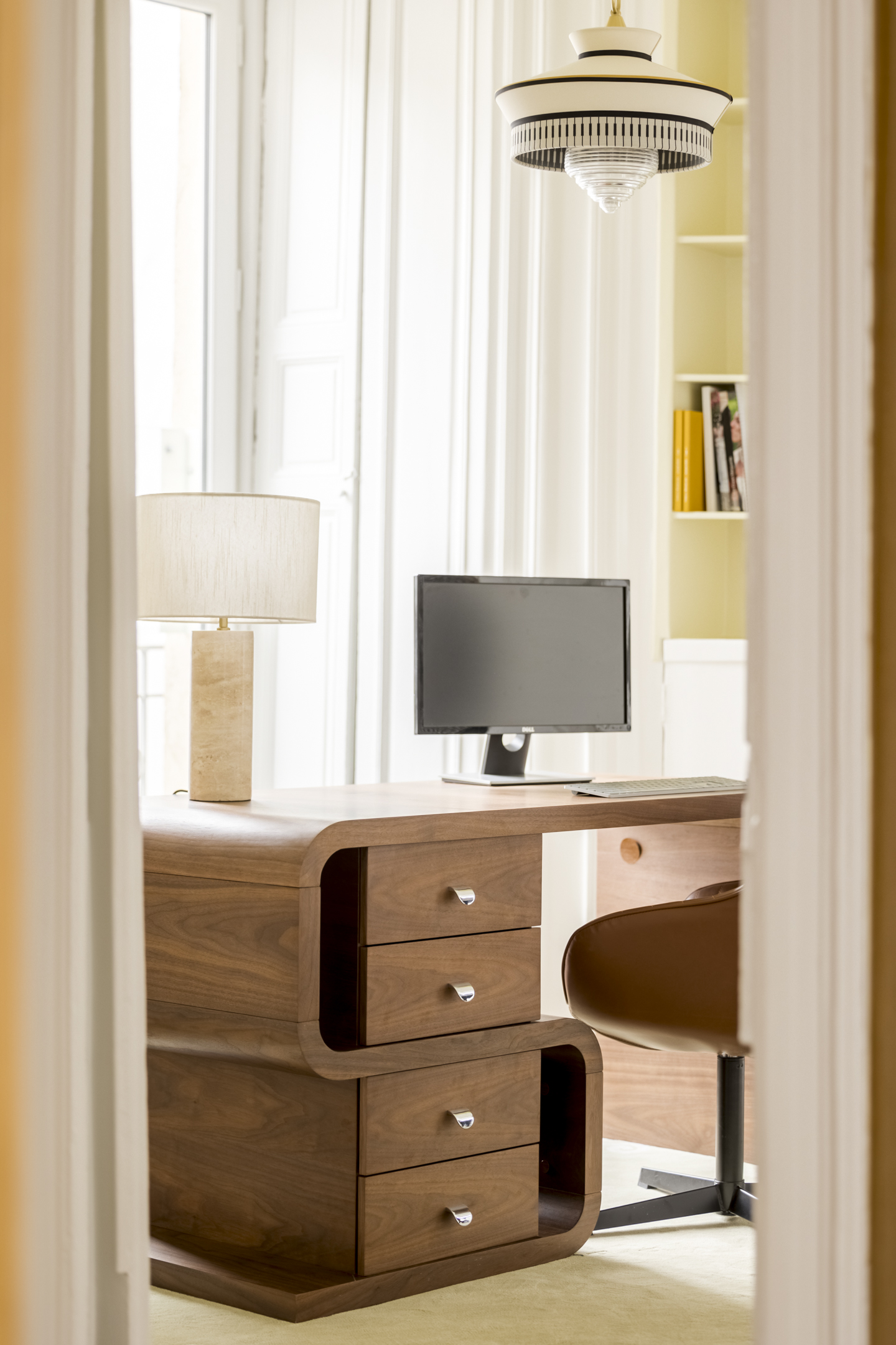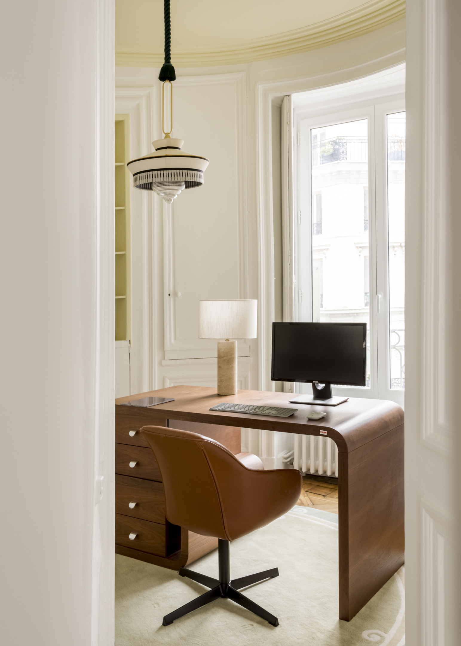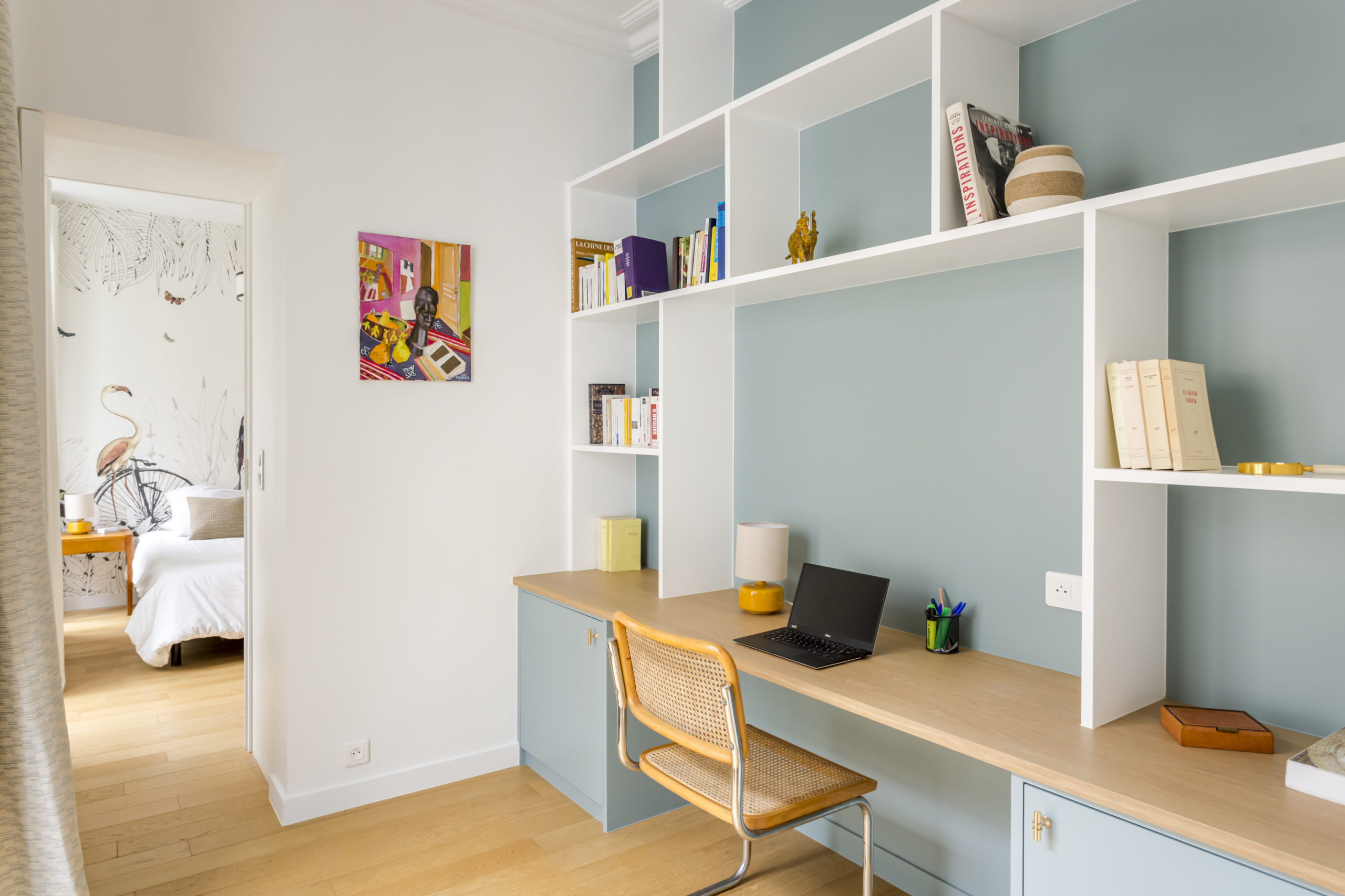 Le propriétaire a acheté ce bel écrin et voulait le meubler et lui donner une touche personnelle. Nous avons poncé les parquets, repeint tout l’appartement, réalisé un bureau-bibliothèque sur-mesure, posé du papier peint et meublé tout l’appartement. Un résultat à la fois élégant et intemporel avec de très belles références.